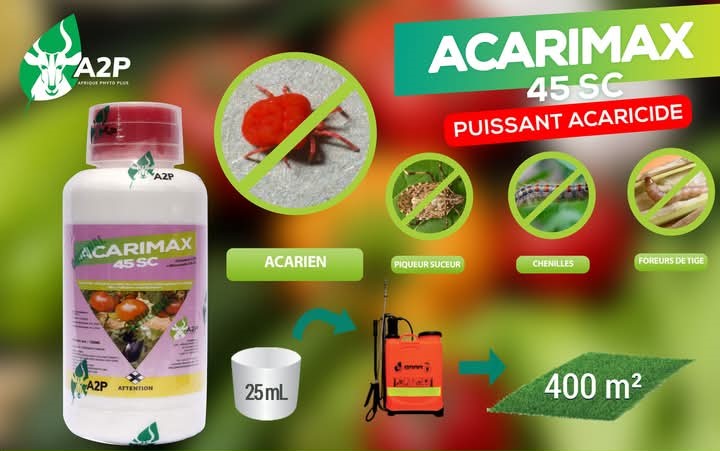 ACARIMAX 45 SC est un puissant insecticide très efficace contre les acariens, les insectes piqueurs suceurs, les chenilles, les foreurs de tige et autres des cultures maraichères.