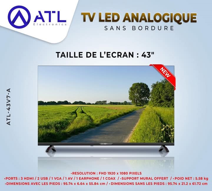 ATL TV LED Analogique sans bordure 43 » FHD 1920 x 1080 Pixels ATL-43H18-A Décodeur intégré 5.58 kg.