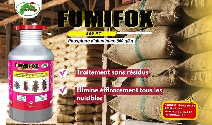 FUMIFOX 560 FT, sous forme de comprimé fumigène, est un insecticide destiné au traitement des insectes des denrées stockées : cacao, café, riz, maïs, haricot grain, niébé, soja, et divers autres céréales.