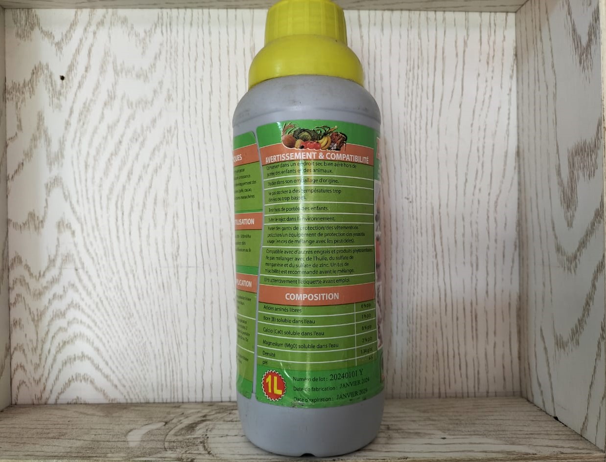 | Cacao, café, anacarde, agrume, manguier | 50 ml / 12 – 20 litres d’eau en application foliaire dès l’apparition des premières fleurs