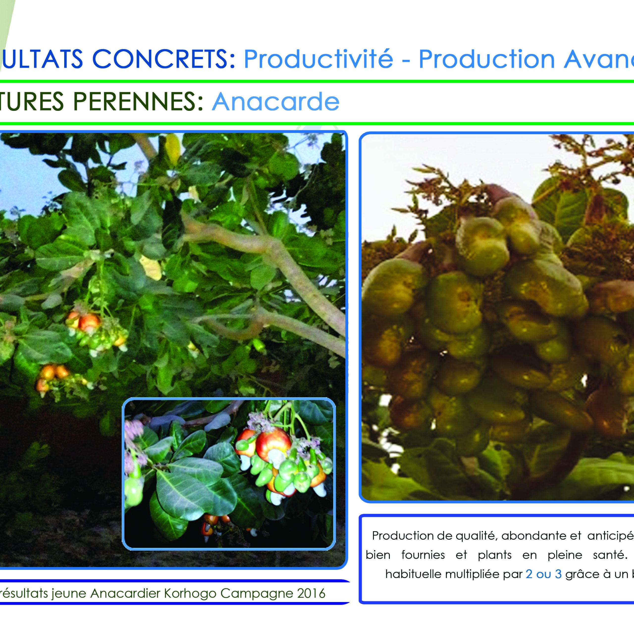 - Cultures de rente : anacarde, café, cacao, palmier à huile, hévéa, coton, etc.
