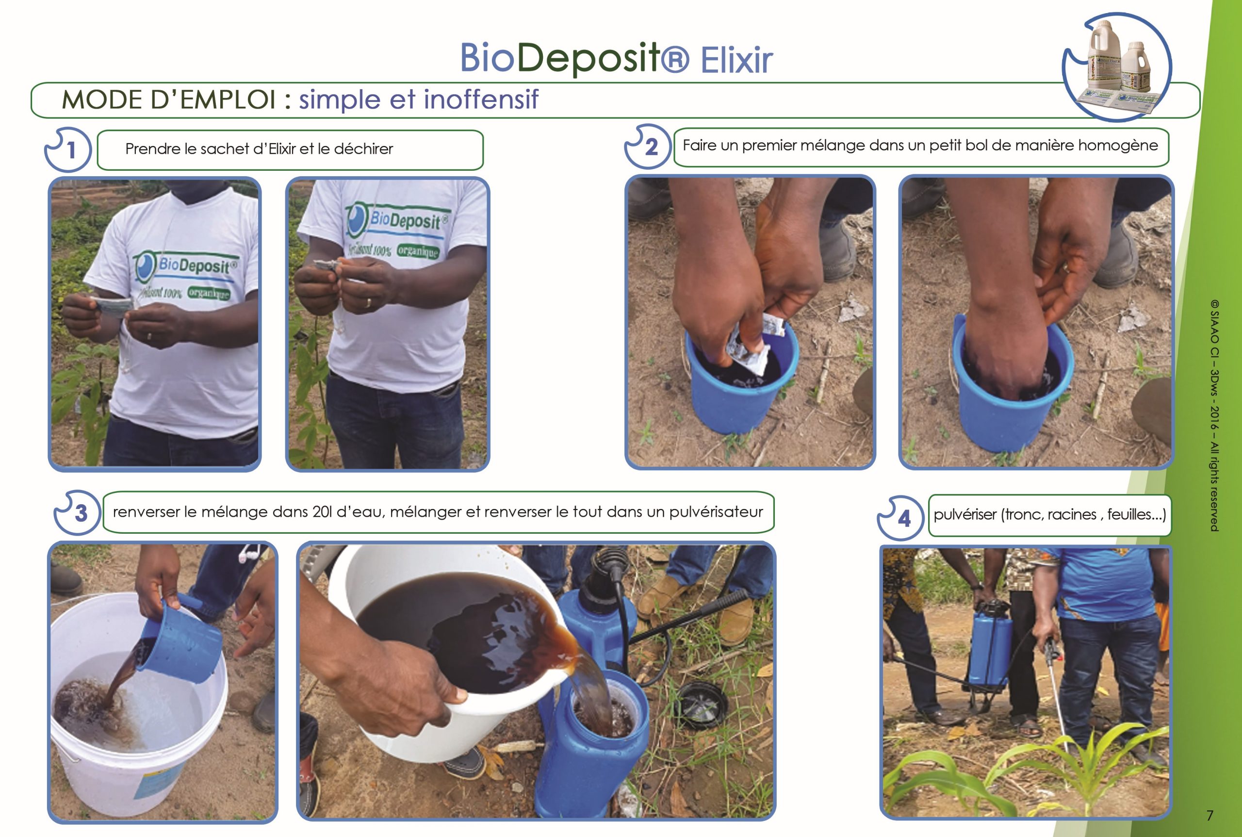 Diluer BIODEPOSIT ELIXIR avec de l’eau dans une proportion de 1:1000, c’est-à-dire diluer un sachet de 12 ml dans 10 litres d’eau et verser sur une fosse à compost.