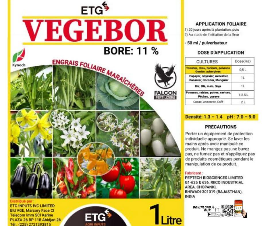 VEGEBOR (Bore 11%) est un engrais liquide micro nutritif pour les cultures qui ont besoin de bore supplémentaire. VEGEBOR (Bore 11%) est soluble dans l’eau et est facilement assimilé et absorbé par les cultures en application foliaire. Il est à la fois une solution à la fois préventive et curative pour contrôler l’insuffisance et la carence en bore des cultures.