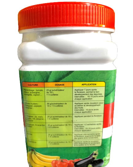 | Arbres fruitiers : manguier, papayer, bananier, etc. | 30 gr / pulvérisateur de 15 litres = 5 cuillères