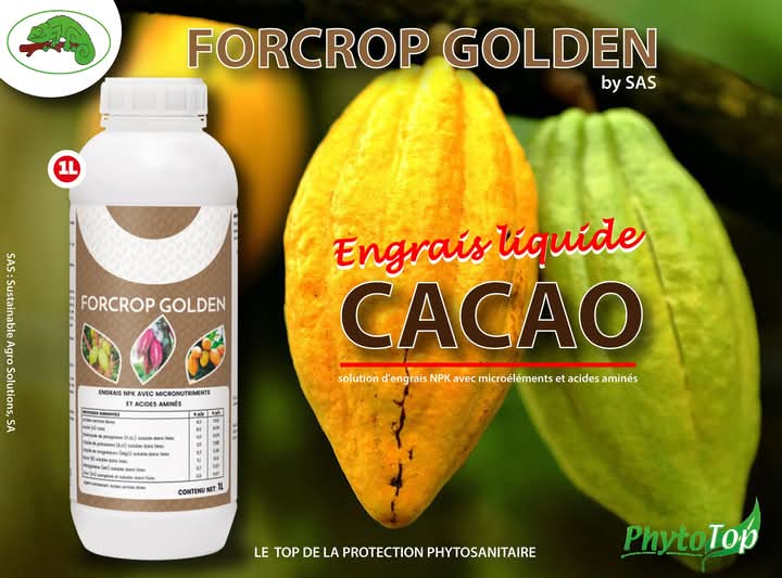 FORCROP GOLDEN est une solution d’engrais NPK avec microéléments et acides aminés pour un meilleur développement et une bonne production du cacaoyer.