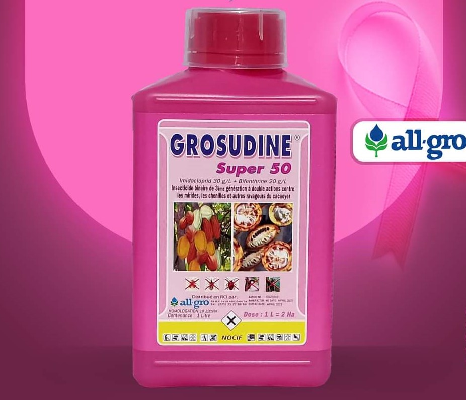 GROSUDINE SUPER 50 est un Insecticide binaire, à double action de choc, systémique qui agit par contact et par inhalation sur les capsides, les foreurs de troncs et autres insectes nuisibles du cacaoyer.
