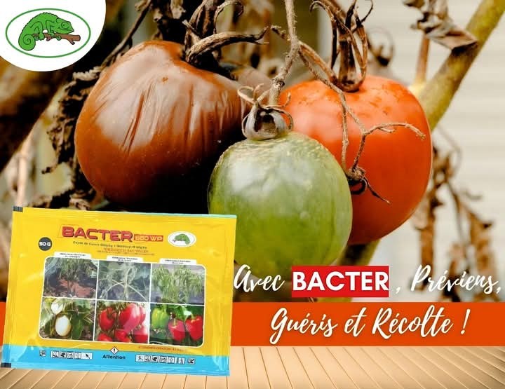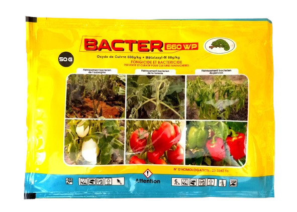 BACTER 660 WP est à la fois un fongicide et un bactéricide de contact et systémique très efficace pour la protection des cultures maraichères (TOMATE, AUBERGINE, PIMENT, CHOU, etc.), fruitières (ANANAS, PAPAYE, etc.) et florales contre les maladies fongiques et bactériennes.