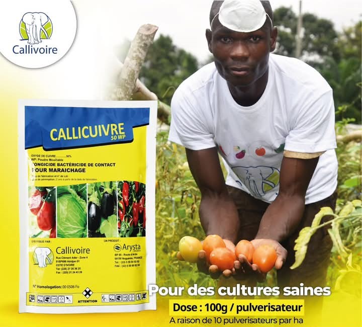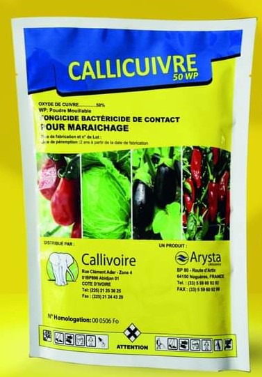 CALLICUIVRE 50 WP est un fongicide bactéricide de contact à action préventive pour les cultures maraichères et du cacao.