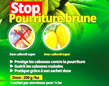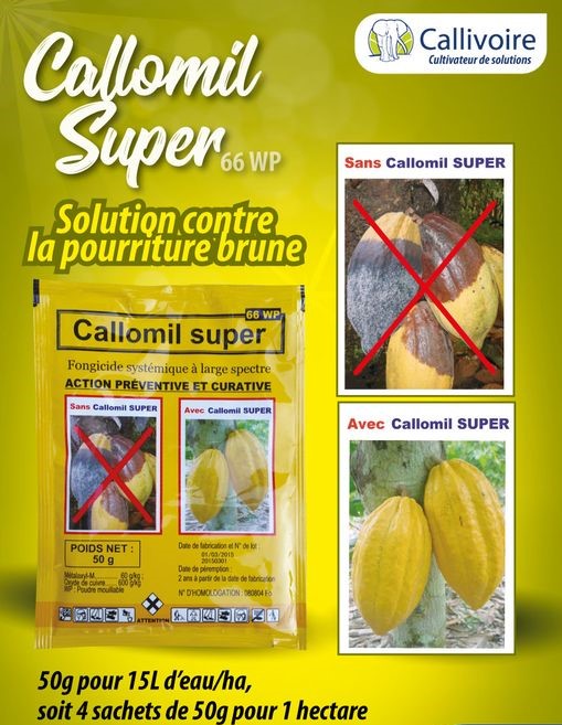 CALLOMIL SUPER 66 WP est un fongicide systémique à large spectre à action préventive et curative contre la pourriture brune du cacao.
