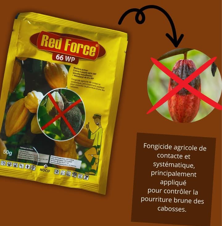 RED FORCE 66 WP est un fongicide agricole en granulés de contact et systémique, principalement appliqué pour maitriser la pourriture brune des cabosses.