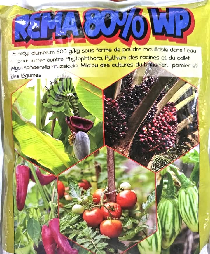 REMA 80% WP est un fongicide granulé pour lutter contre phytophthora, pythium des racines et du collet mycosphaerella rruzsicola, mildiou des cultures du bananier, du palmier à huile et des légumes.