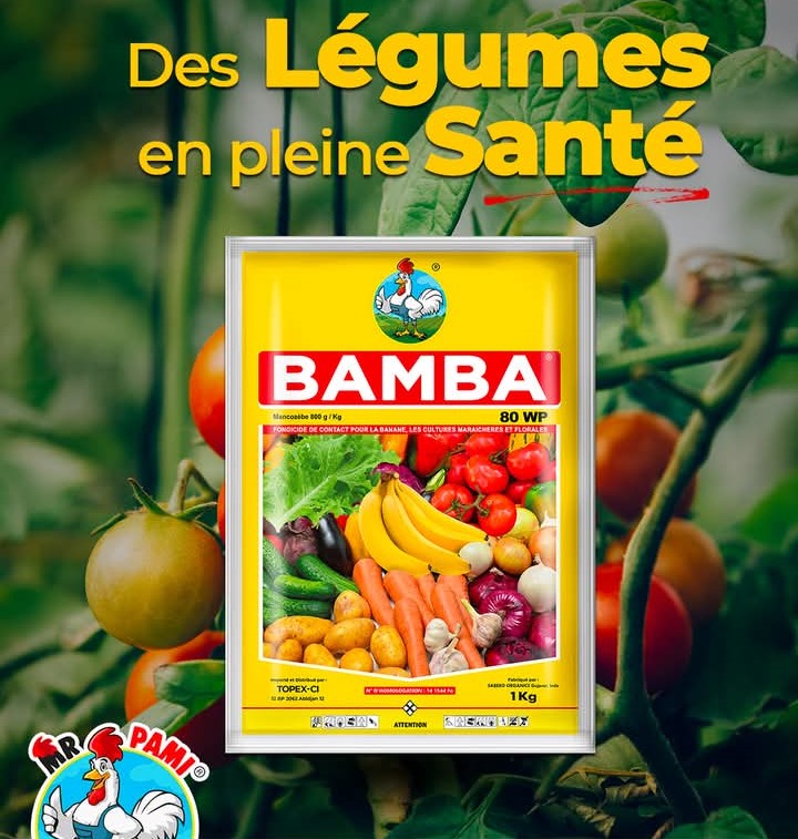 BAMBA 80 WP est un fongicide formulé en poudre mouillable (WP) destinée à être dispersée dans l’eau pour être appliqué par pulvérisation. Ce produit de la famille des dithiocaramates, agit préventivement et offre une très bonne rémanence contre de très nombreuses maladies des cultures vivrières, fruitières et maraichères notamment de la tomate et de la laitue : alternariose, anthracnose, cercosporiose, cladosporiose, rouille et mildiou (phytophtora infestants), etc.