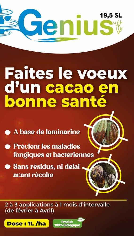GENIUS 19.5 SL est un fongicide à base de laminaire, 100% biologique pour le cacao. Il stimule le cacaoyer à bien se défendre
