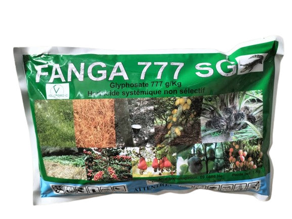 FANGA 777 SG est un herbicide systémique non sélectif agissant par absorption foliaire. Il est extremement efficace sur les Monocotylédones (particulièrement sur les espèces à rhizomes et bulbes tels que Cypercus et Imperata cylindrica) et les Dicotylédones d’où son utilisation comme débroussaillant avant la mise en place des cultures (coton, riz, maïs, cultures maraichères et autres vivriers).