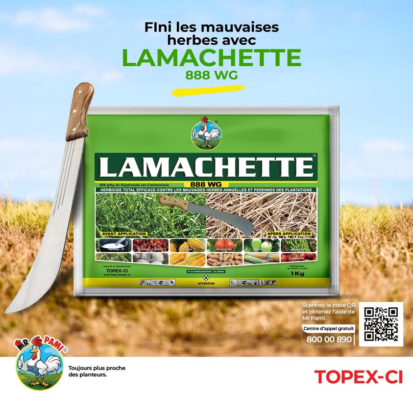 LAMACHETTE 888 WG est un puissant herbicide total en granulés, soluble, pour la lutte contre les mauvaises herbes annuelles et pérennes des plantations et des espaces non agricoles enherbés.
