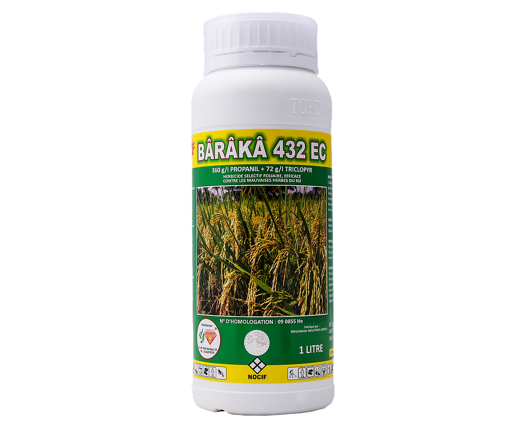 BÂRÂKÂ 432 EC est un herbicide sélectif foliaire contre les mauvaises herbes de la culture du riz pluvial et irrigué permettant un désherbage efficace des parcelles cultivées.