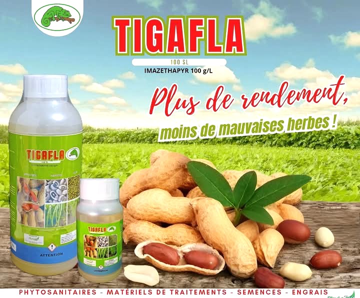 TIGAFLA 100 SL est un herbicide conçu pour la destruction des mauvaises herbes en culture d’arachide plus particulièrement, mais aussi applicable aux cultures de haricot, de soja.