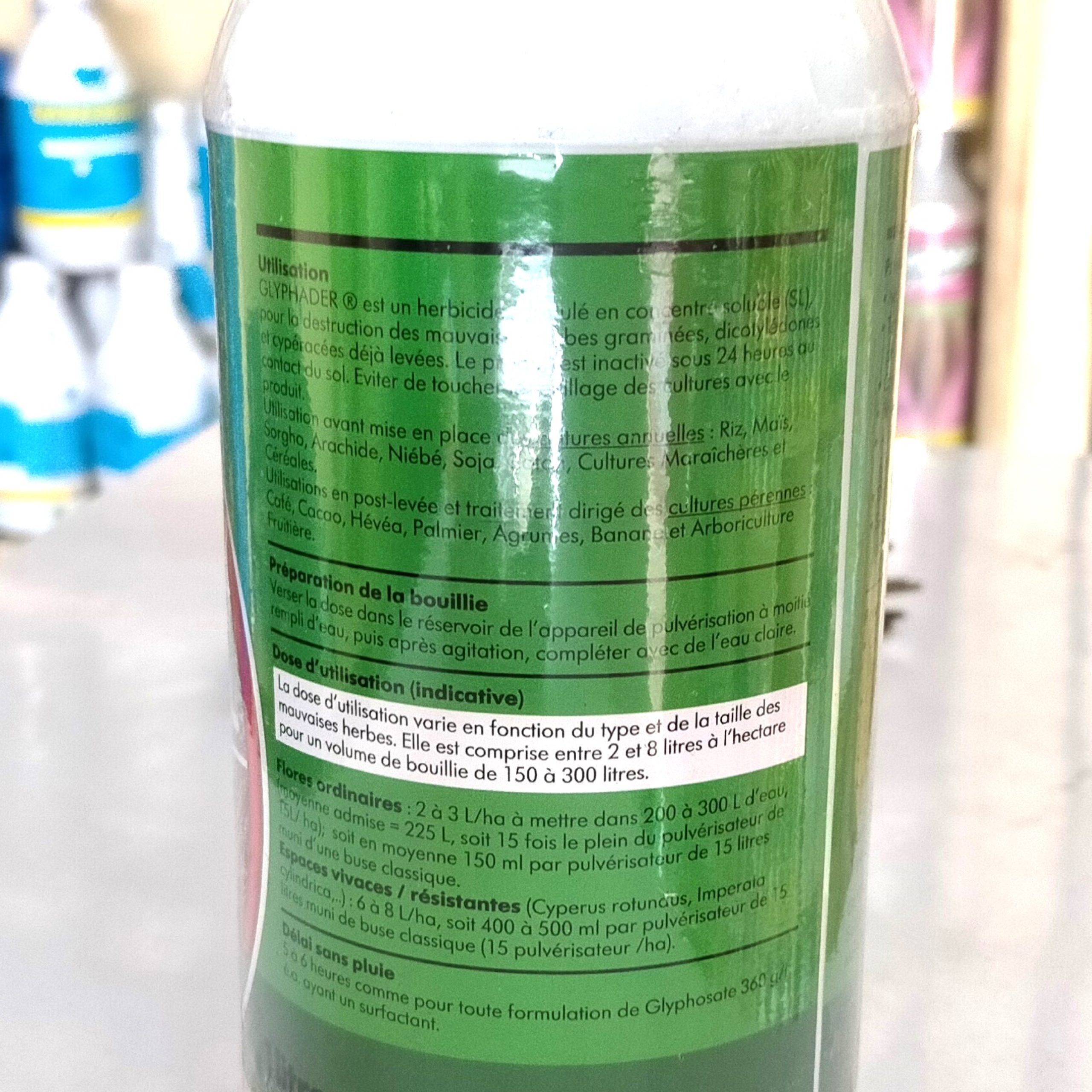 L’application de GLYPHADER  360 SL 1 litre peut être doublée 15 jours après en utilisant jusqu’à la moitié de la dose prescrite. Cependant ce traitement n’est applicable que si la hauteur de la végétation ne passe pas 60 cm. Au-delà, il est conseillé de rabattre les herbes mécaniquement à la machette et d’appliquer GLYPHADER 360 SL 1 litre au minimum une semaine plus tard ou bien augmenter la dose ou plus suivant le type, la taille et l’âge des adventices.
