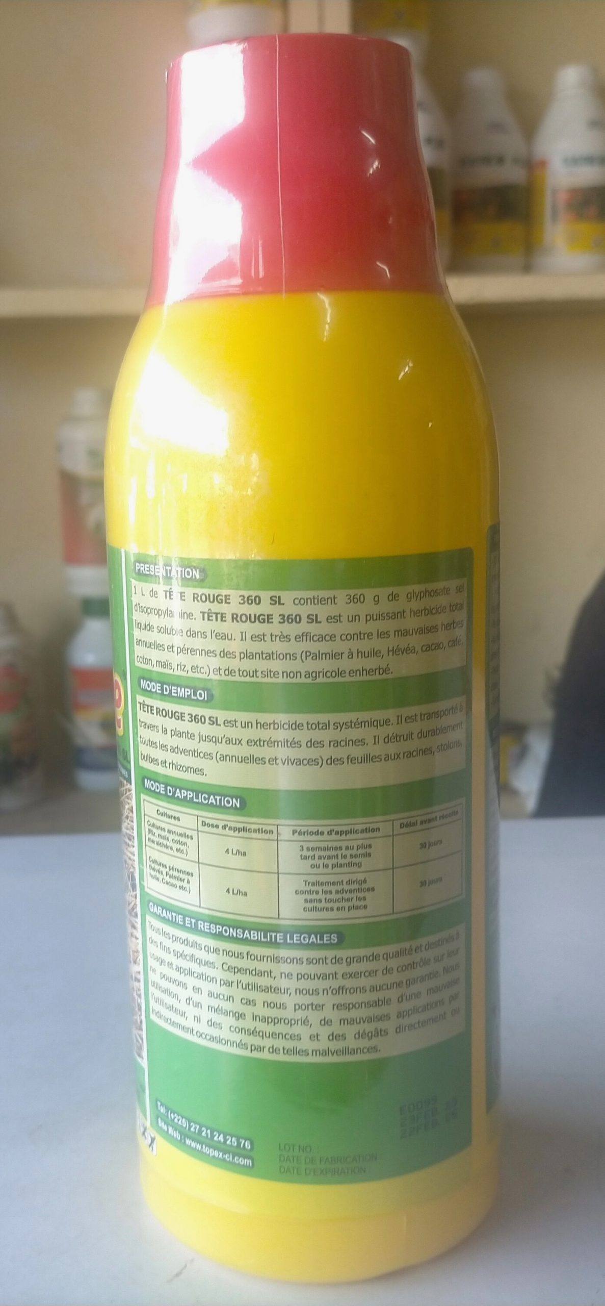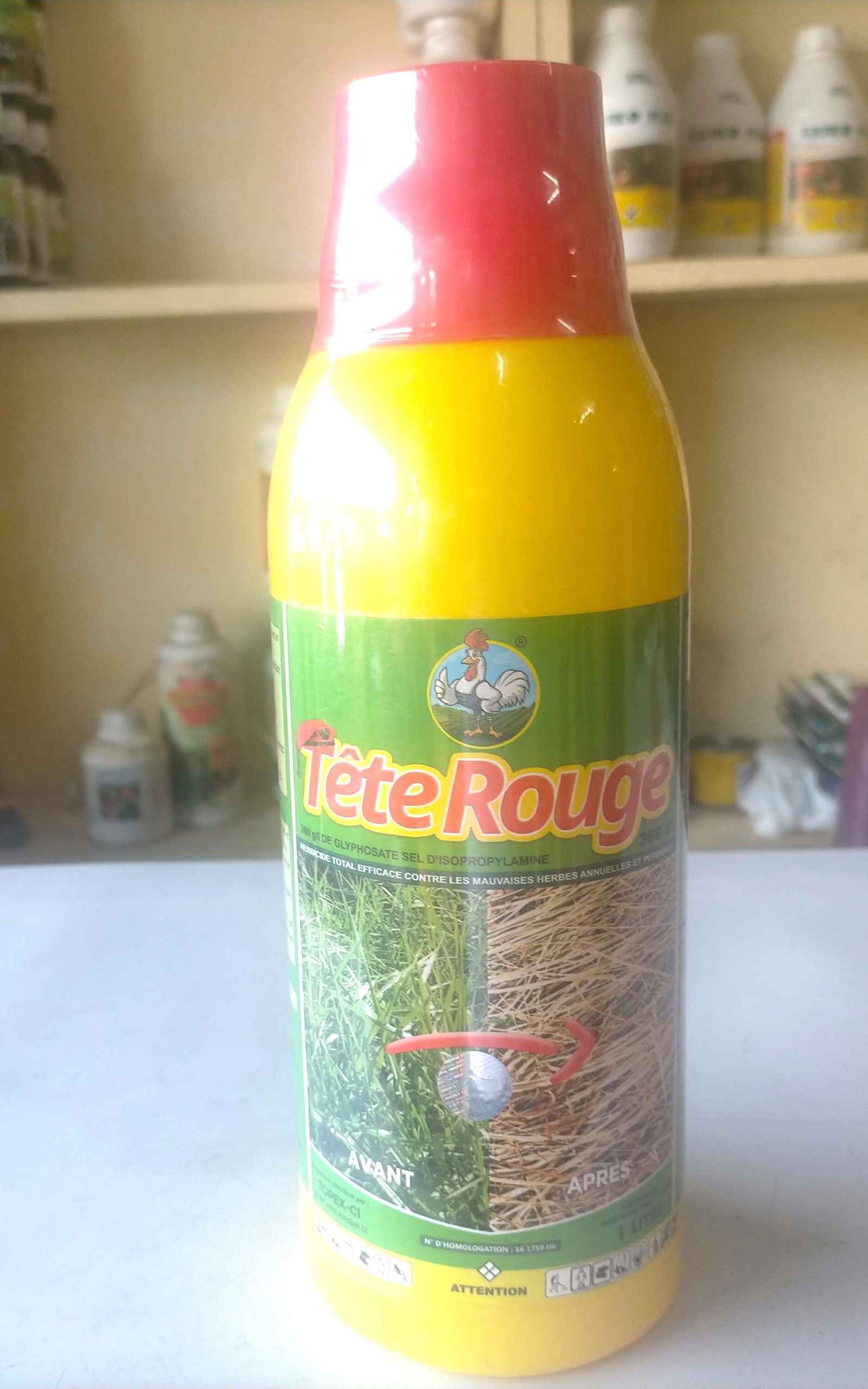 1 litre de TETE ROUGE 360 SL contient 360 g de glyphosate sel d’Isopropylamine. TETE ROUGE 360 SL est un puissant herbicide total liquide soluble dans l’eau. Il est très efficace contre les mauvaise herbes annuelles et pérennes des plantations (palmier à huile, hévéa, cacao, café, coton, riz, maïs, etc.) et de tout site non agricole enherbé.