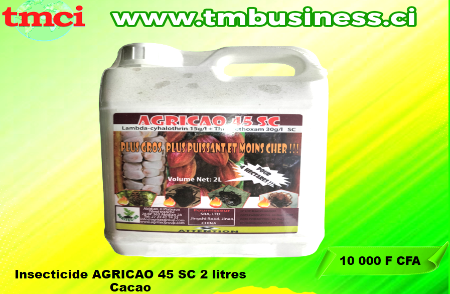 AGRICAO 45 SC 2 litres est un insecticide indiqué pour lutter contre les mirides, foreurs de tronc et autres insectes nuisibles du cacao.