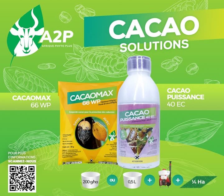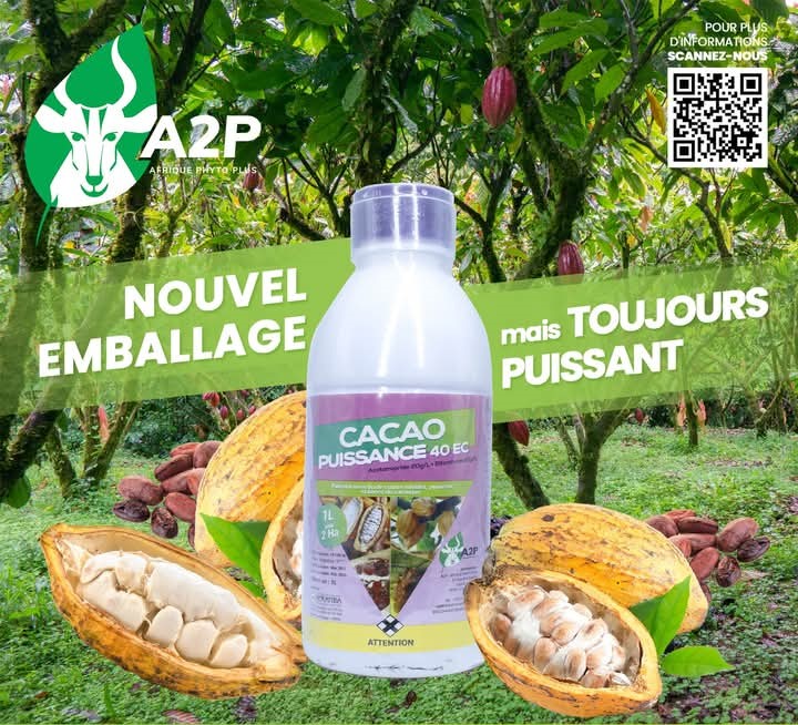 CACAO PUISSANCE 40 EC est un Insecticide binaire formulé pour le contrôle des ravageurs en culture de cacao.