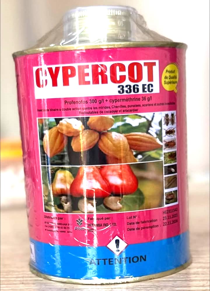 CYPERCOT 336 EC est un insecticide binaire à double action contre les mirides, les chenilles, les punaises, les acariens et autres insectes redoutables du cacaoyer et de l’anacardier.