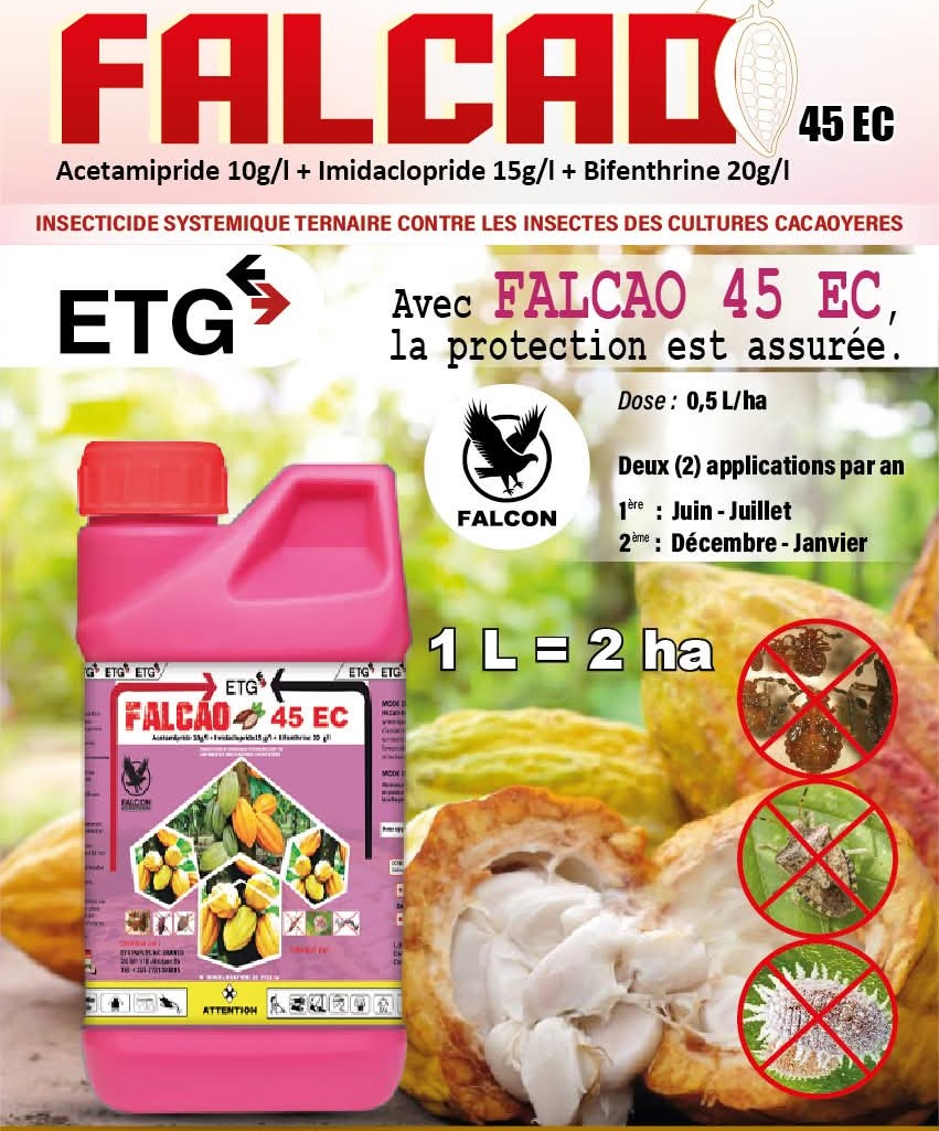 FALCAO 45 EC est un puissant insecticide systémique ternaire contre les insectes des cultures cacaoyères.