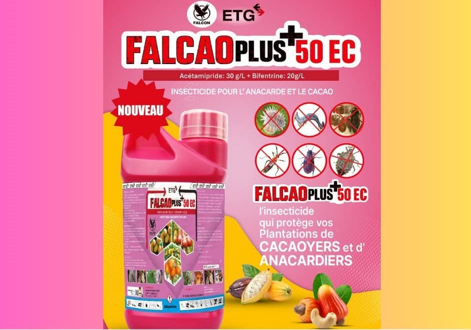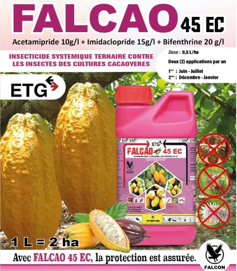 FALCAO PLUS+ 50 EC est un insecticide liquide conçu pour la destruction des insectes ravageurs des plantations de cacaoyers et d’anacardiers.
