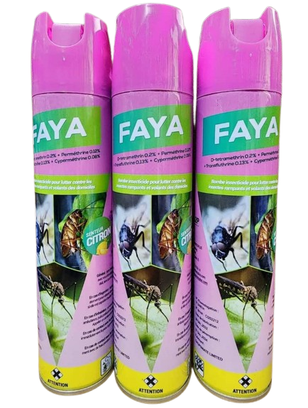 FAYA est une bombe insecticide en spray à utiliser dans les domiciles, spécialement concu pour lutter contre les insects rampants et volants par pulvérisation directe.