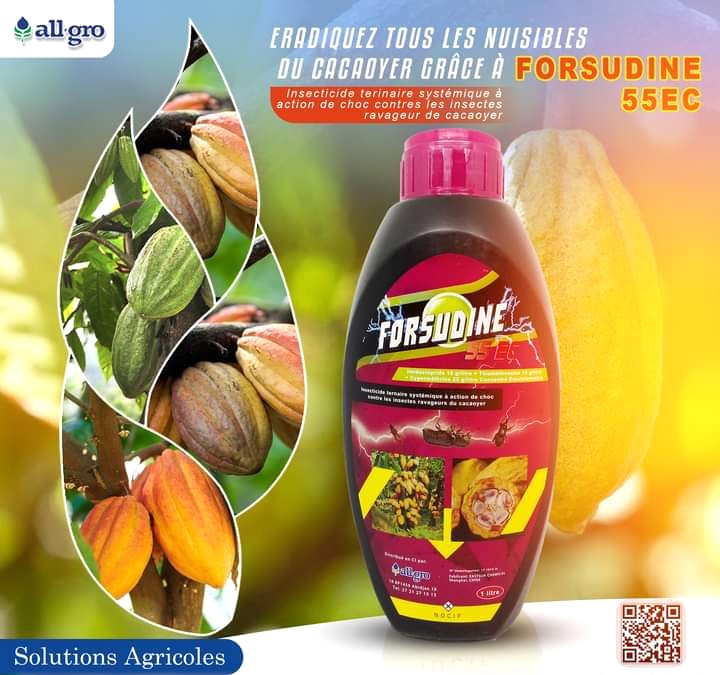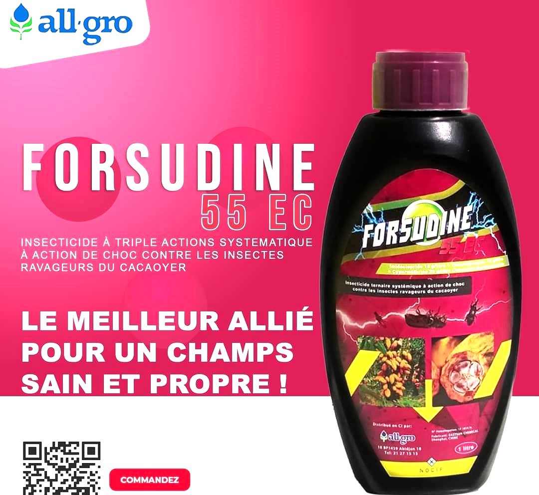 FORSUDINE 55 EC est un insecticide ternaire systémique à action de choc contre les insectes ravageurs du cacaoyer.