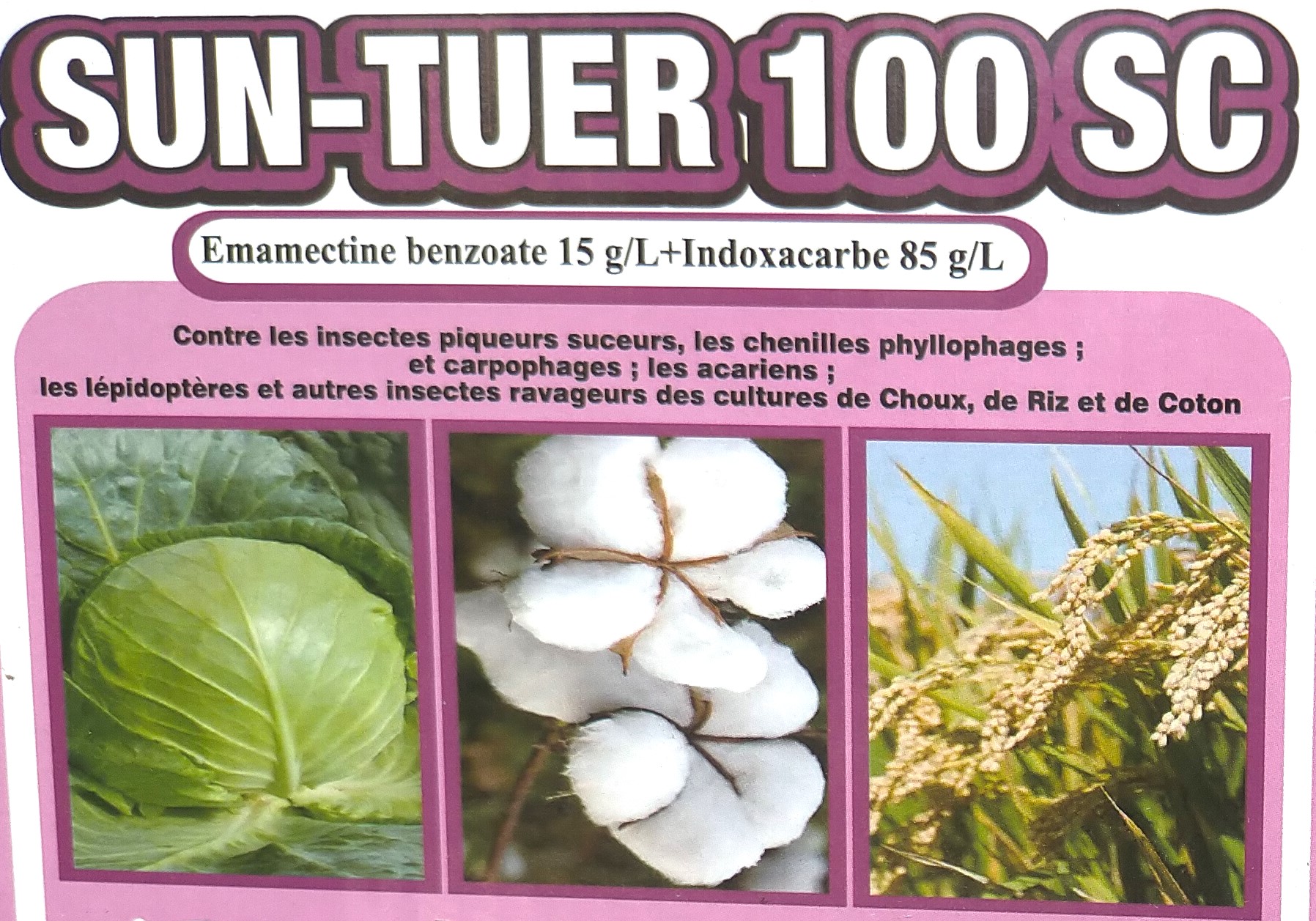 SUN-TUER 100 SC est un insecticide efficace pour la lutte contre les insectes piqueurs suceurs, les chenilles phyllophages et carpophages, les acariens, les lépidoptères et autres insectes ravageurs des cultures de choux, de riz et de coton.