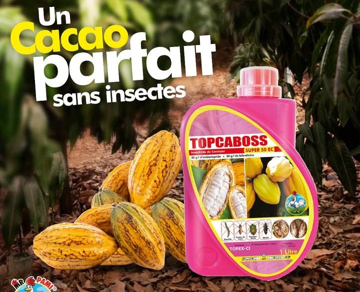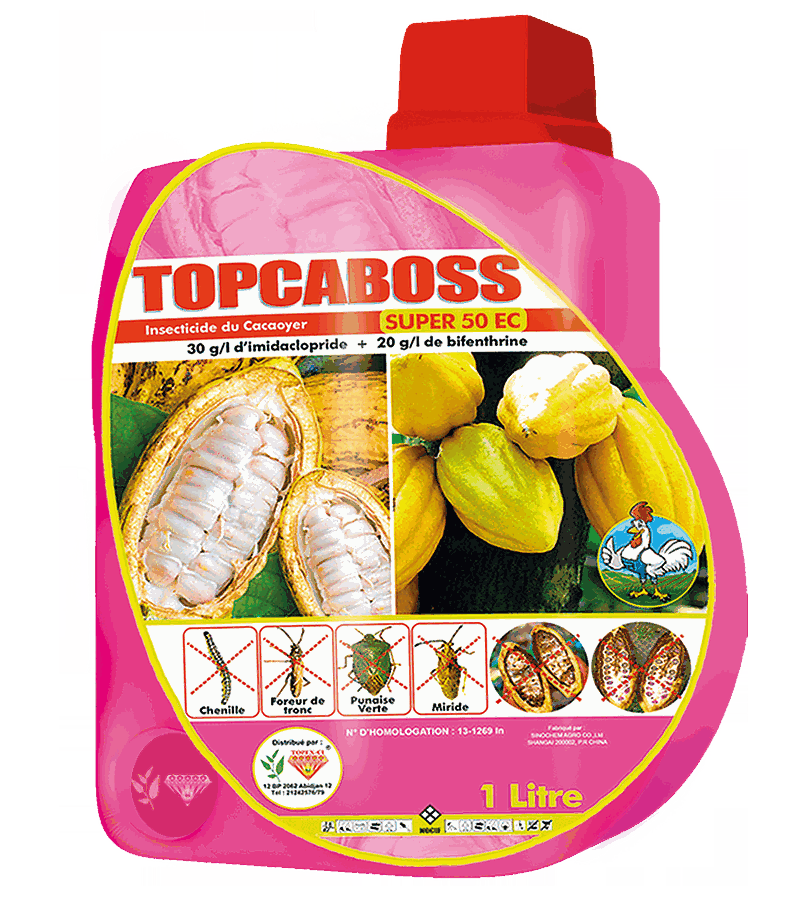 TOPCABOSS SUPER 50 EC est un insecticide systémique de contact, d’ingestion efficace contre les insectes ravageurs du cacaoyer.
