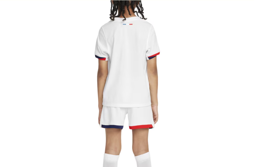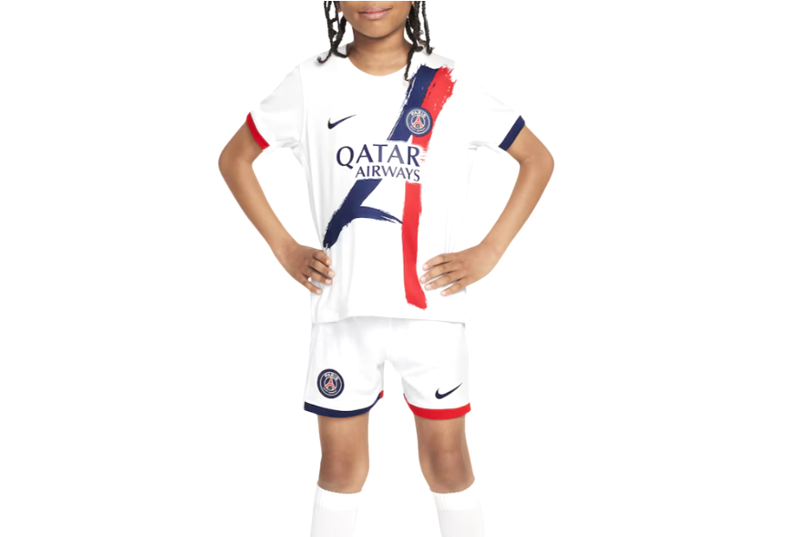 Le maillot PARIS SAINT-GERMAIN Extérieur 2024 – 2025 rend hommage à une tunique iconique du Club portée par les Parisiens lors des saisons 1990 – 1991 et 1991 – 1992, tout en incarnant l’esprit d’innovation du club de la nouvelle génération. Ornée de deux bandes rouge et bleue, cette tunique blanche s’inspire de la silhouette emblématique de la tour Eiffel. Le maillot sera arboré par l’ensemble des équipes du Paris Saint-Germain, de son équipe professionnelle homme à sa section féminine en passant par les équipes de son centre de formation.