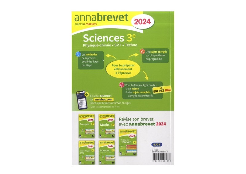Une préparation progressive à l’épreuve de sciences (SVT, physique-chimie, technologie), avec des sujets corrigés récents, des fiches de méthode et des fiches mémo. Un accompagnement efficace pour réussir son brevet en 2024. Un ouvrage en trois parties :