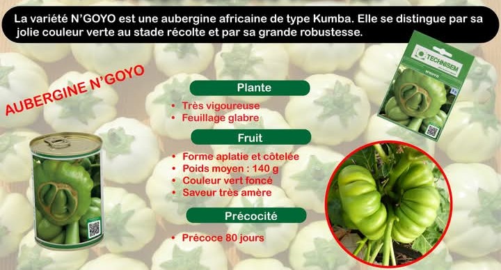 La variété N’GOYO est une aubergine Africaine de type Kumba. Elle se distingue par sa jolie couleur verte au stade récolte et par sa grande robustesse.