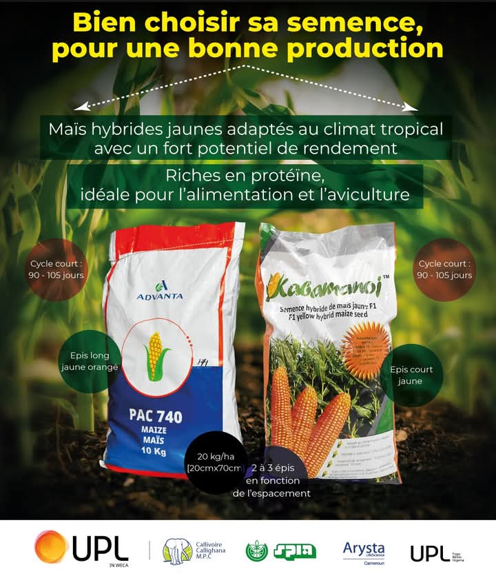 La semence de maïs jaune KABAMANOJ F1 est une variété hybride de maïs de qualité à cycle court, résistante aux maladies et très productive (récoltes en quantité), adaptée aux conditions agro climatiques. Elle peut être cultivée toute l’année