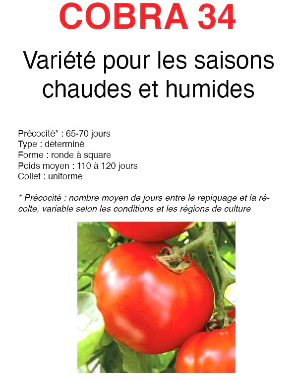 La variété hybride de TOMATE F1 COBRA 34 (Solanum IycopersicumL.) dispose des mêmes qualités (qualité de coloration, fermeté des fruits, adaptation aux saisons humides,…) que la TOMATE COBRA 26 F1 mais aura l’avantage de produire des calibres plus importants. En clair, c’est une variété pour les saisons chaudes et humides.