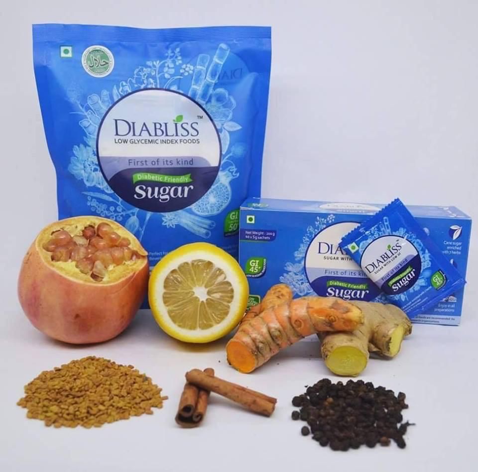DIABLISS est un sucre de canne 100% naturel, agréable, conçu pour les diabétiques et les non diabétiques. DIABLISS est riche de sept (7) épices, plantes naturelles et millénaires connues pour leurs propriétés antioxydants, anti-inflammatoires, digestives, d’absorption des nutriments et leurs avantages en matière de régulation métabolique. C’est un sucre unique à faible indice glycémique. Il est digéré, absorbé et métabolisé lentement.