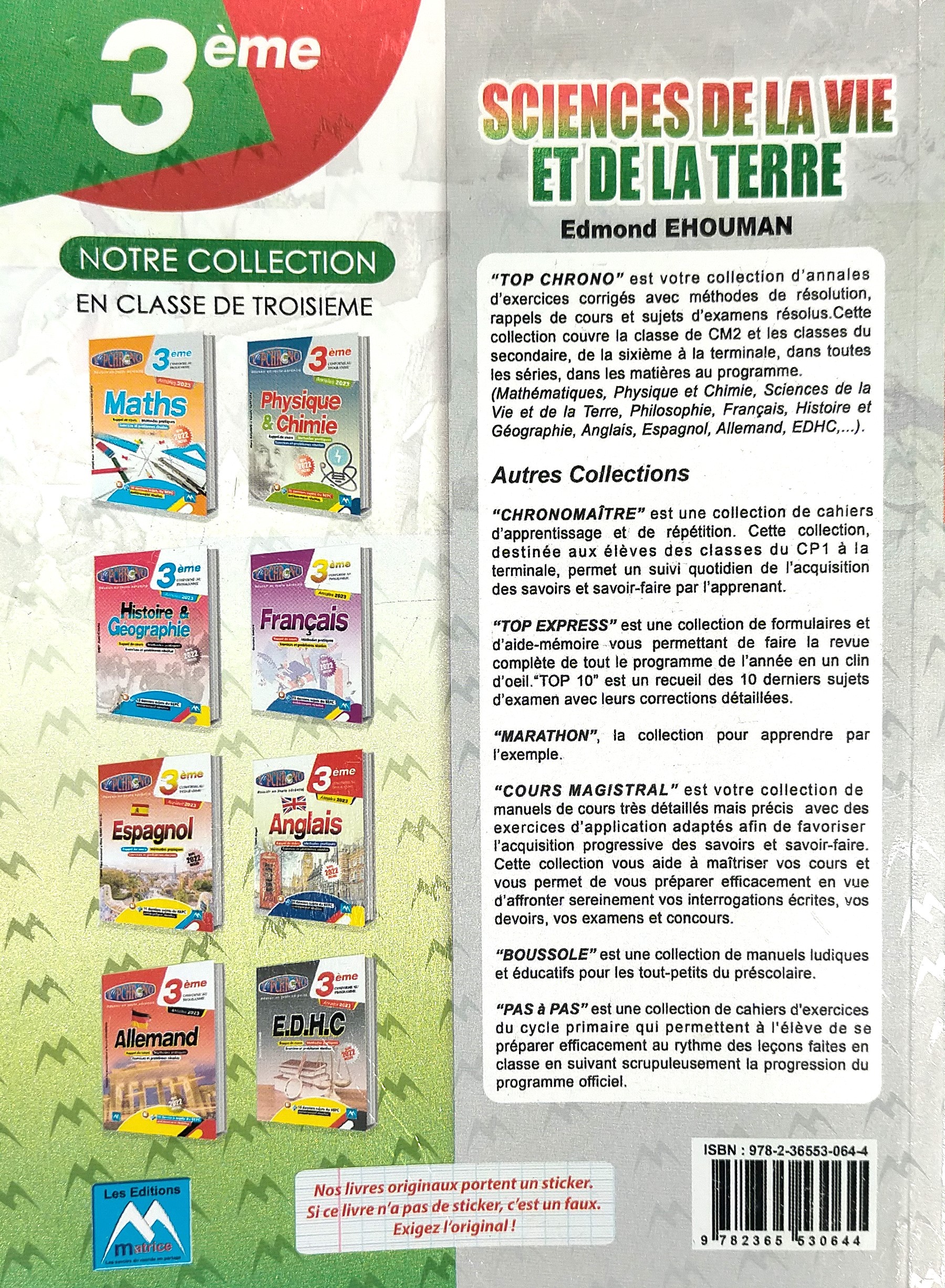‘’TOP CHRONO’’ est votre Collection d’annales d’exercices corrigés avec méthodes de résolution, rappels de cours et sujets d’examens résolus. Cette collection couvre la classe de CM2 et les classes du secondaire, de la sixième à la terminale, dans toutes les séries, dans les matières au programme.