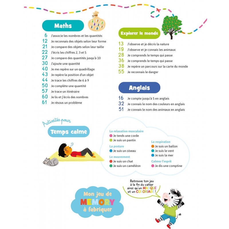 Bravo les maternelles – Tout le programme – Grande Section est un cahier rassurant et ludique qui permet à votre enfant de 5-6 ans de revoir toutes les notions abordées durant l’année de grande section. La mascotte Muso l’accompagnera tout au long de l’aventure et lui donnera des astuces pour réussir les activités, les jeux et les exercices de relaxation. Le cahier d’activités Bravo les maternelles – Tout le programme – Grande Section rassemble toutes les notions vues en classe et propose à l’enfant des activités ludiques, illustrées et progressives. Le cahier s’adresse également aux parents avec des conseils figurant au début de l’ouvrage. En Grande Section, l’enfant est accompagné tout au long du livre par le petit zèbre, Muso, qui lui pose des questions, lui donne des conseils, et l’encourage. Les notions se répartissent en 6 domaines : Graphisme/Ecriture : maîtrise du geste ; reproduction de formes simples et complexes ; entraînement à l’écriture de toutes les lettres en écriture cursive Lecture : compréhension d’histoires ; identification des sons ; lecture des premières syllabes et mots Maths : comparaison des quantités de 1 à 10 ; écriture des chiffres ; repérage sur un quadrillage Explorer le monde : repérage dans le temps et dans l’espace ; découverte du vivant (animaux, plantes) ; repérage des objets dangereux Anglais : apprentissage du vocabulaire le plus simple Concentration : activités de respiration et de relaxation Et en + : + 110 autocollants en couleur